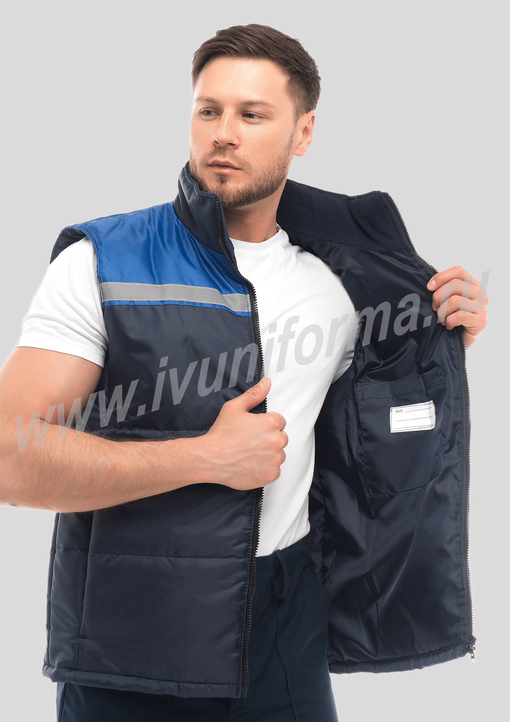 Жилет утепленный на молнии с двумя боковыми карманами в нижней части. Жилет рабочий застегивается на центральную застежку тракторной молнией с двумя замками. Внутренняя часть жилета утеплена синтепоном, а задняя часть воротника выполнена из флиса. Жилет является универсальным для использования как мужчинам, так и женщинам.